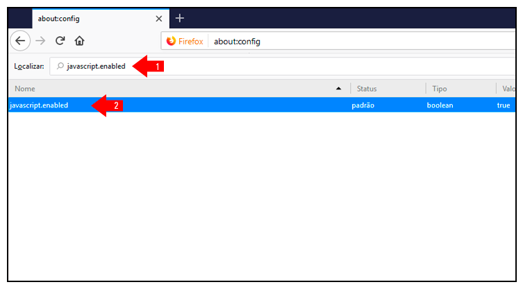 ( 5 ) Clique duas vezes na linha “javascript.enabled” e altere o valor para “true” (2).